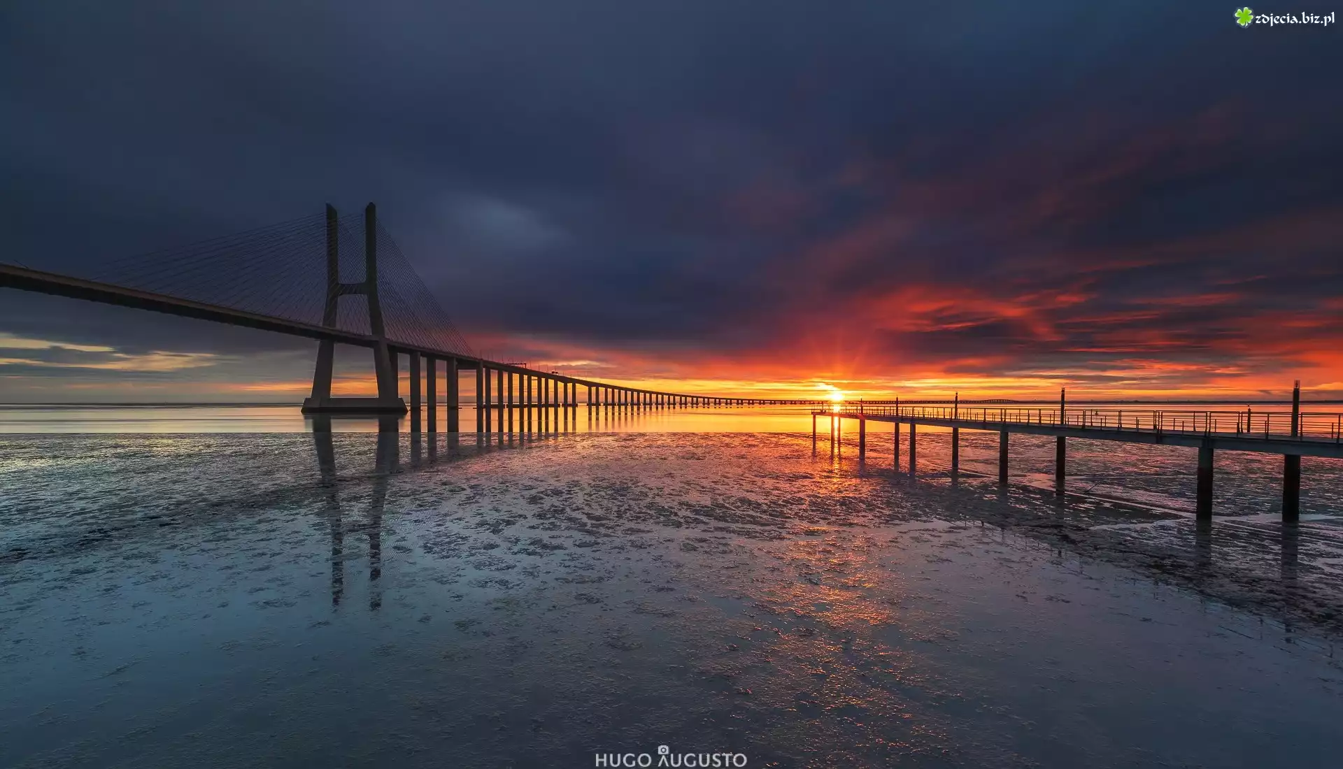 Zdjęcie, Rzeka Tag, Zachód słońca, Niebo, Most, Vasco da Gama, Lizbona, Portugalia