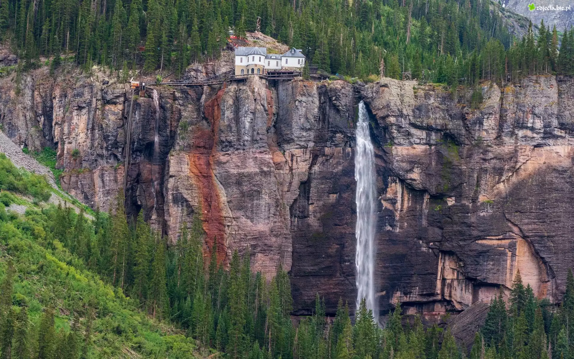 Zdjęcie Stany Zjednoczone, Kolorado, Skały, Wodospad, Bridal Veil Falls, Telluride, Drzewa, Dom