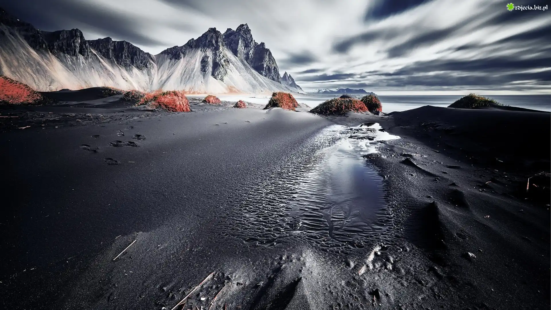 Zdjęcie Góra Vestrahorn, Góry, Plaża Stokksnes, Ciemny, Piasek, Islandia
