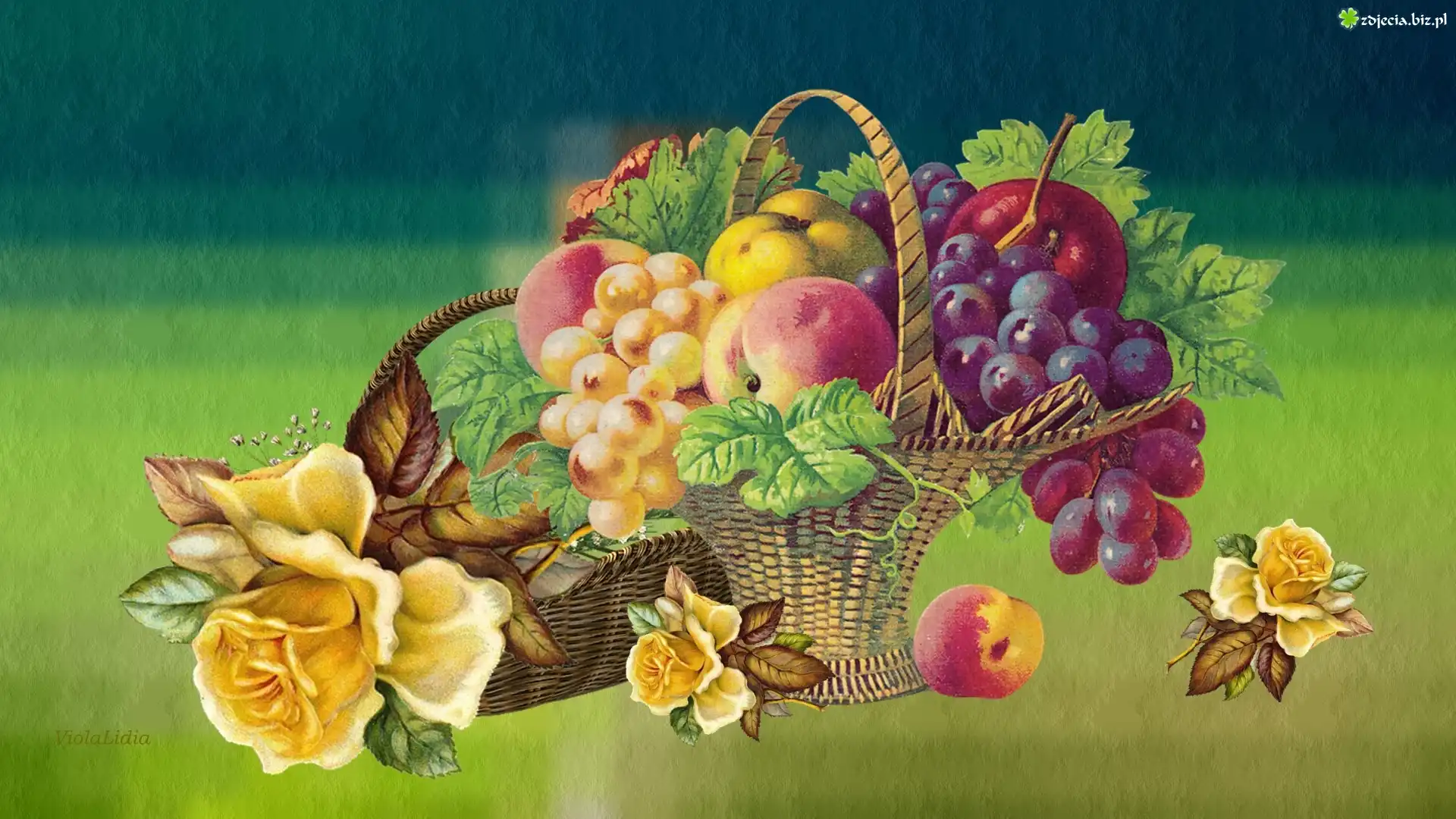 Zdjęcie Grafika, Vintage, Kosz, Owoce, Winogrona, Brzoskwinie, Kwiaty, Róże