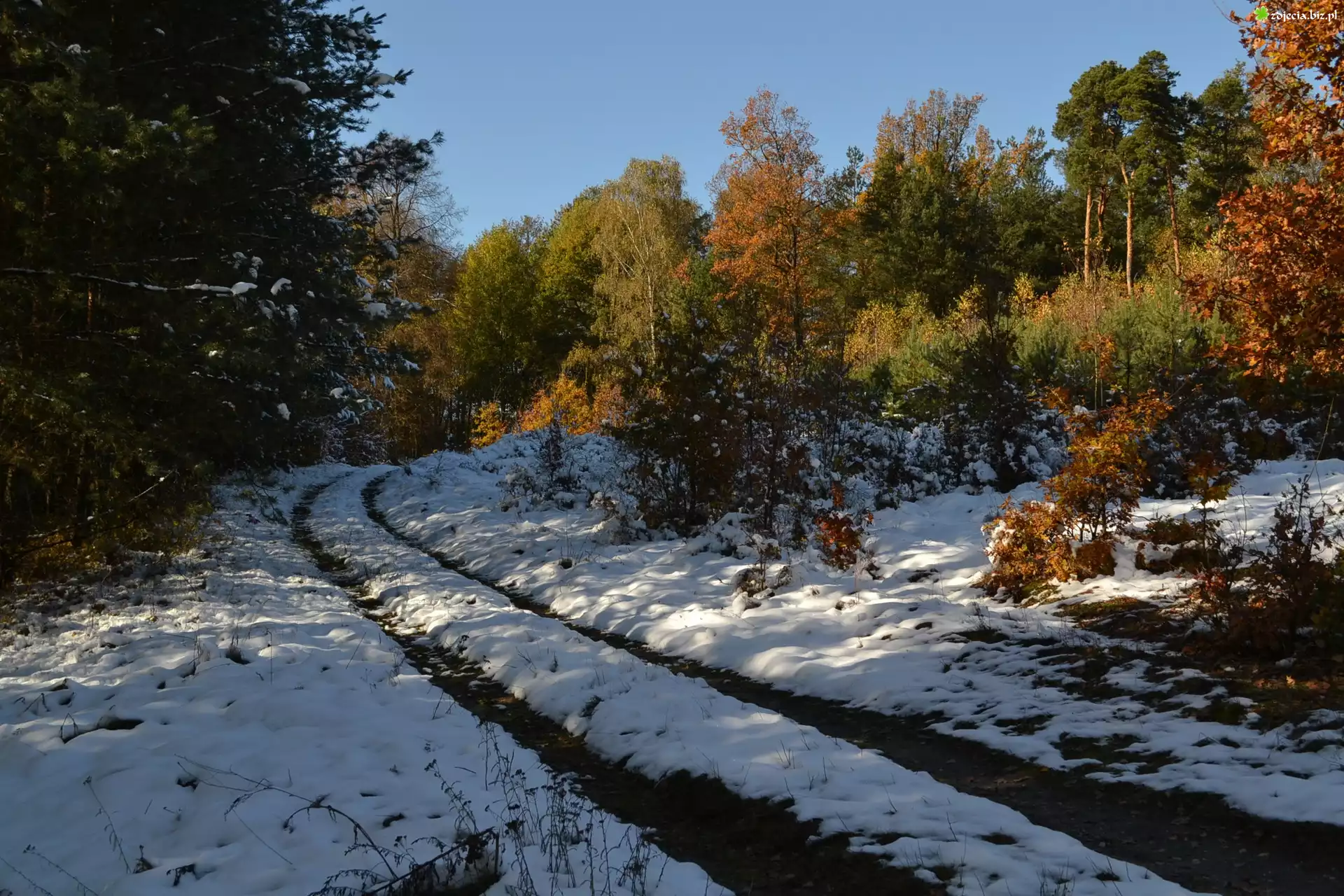 Zdjęcie Droga, W, Lesie, Jesienne, Kolory, Drzew, Pierwszy, Śnieg