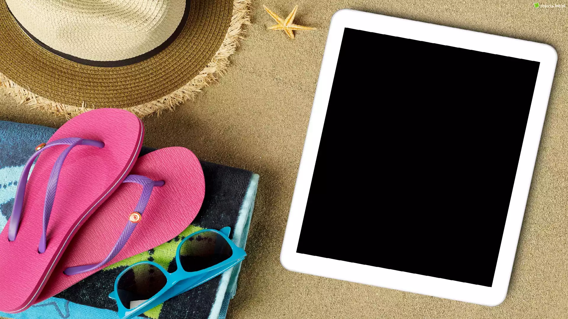 Zdjęcie Kompozycja, Wakacje, Kapelusz, Okulary, Japonki, Ręcznik, Tablet, Lato