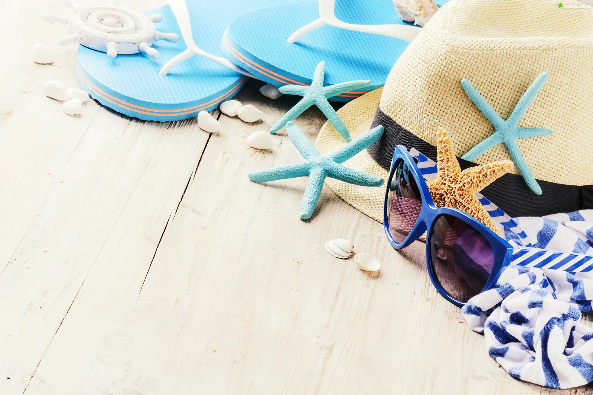 Zdjęcie Wakacje, Lato, Kapelusz, Klapki, Okulary, Rozgwiazdy