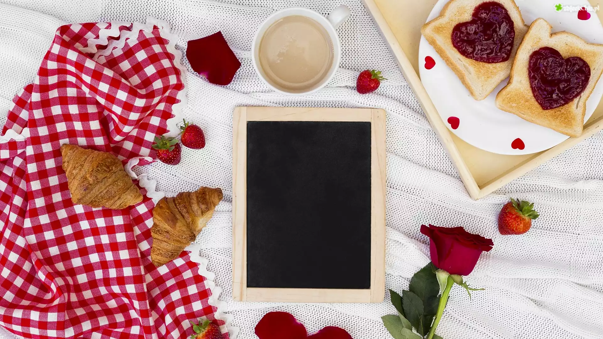 Zdjęcie Śniadanie, Walentynki, Tosty, Serduszka, Croissanty, Kawa, Róża, Taca, Truskawki, Tablica |