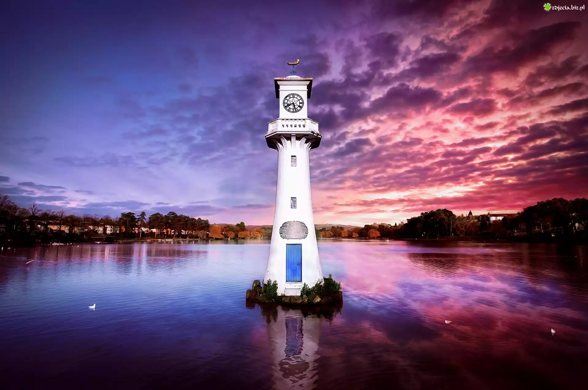 Zdjęcie, Walia, Cardiff, Woda, Zegar, Wieża, Drzewa