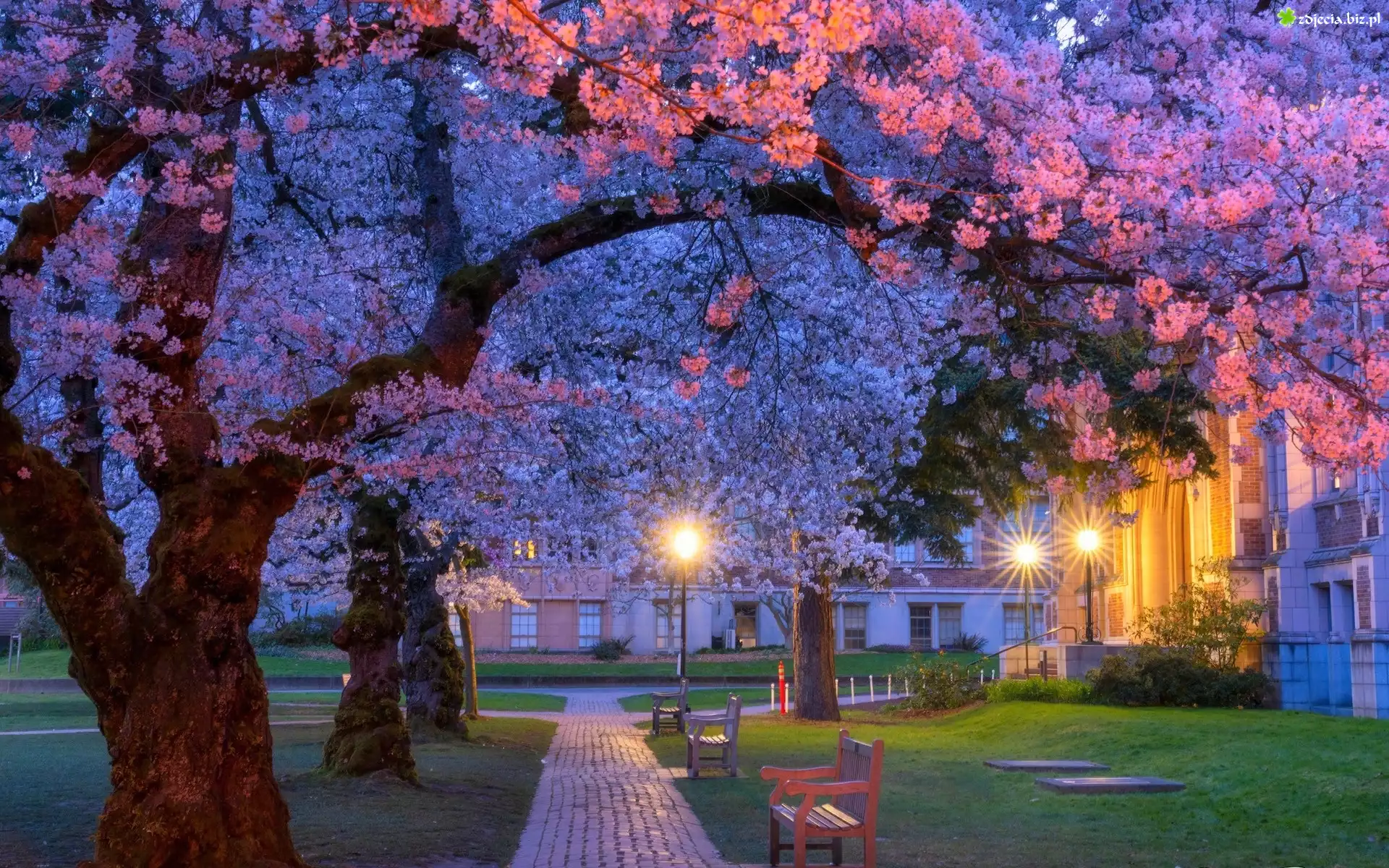 Zdjęcie Stany Zjednoczone, Stan Waszyngton, Uniwersytet Quad, Waszyngton, Budynek, Drzewa owocowe, Latarnie, Ławki, Wiosna |