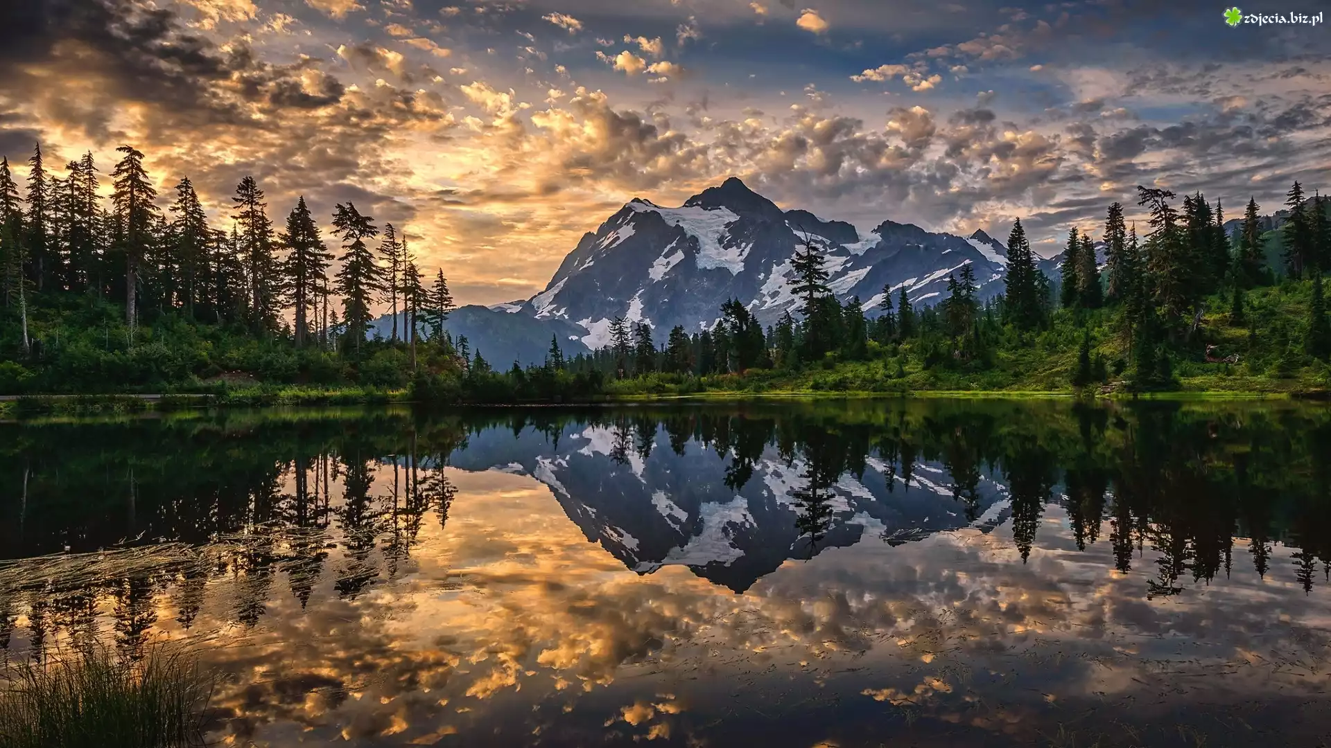 Zdjęcie Jezioro, Picture Lake, Drzewa, Góry, Mount Shuksan, Zachód słońca, Odbicie, Park Narodowy Północnych Gór Kaskadowych, Stan Waszyngton, Stany Zjednoczone |
