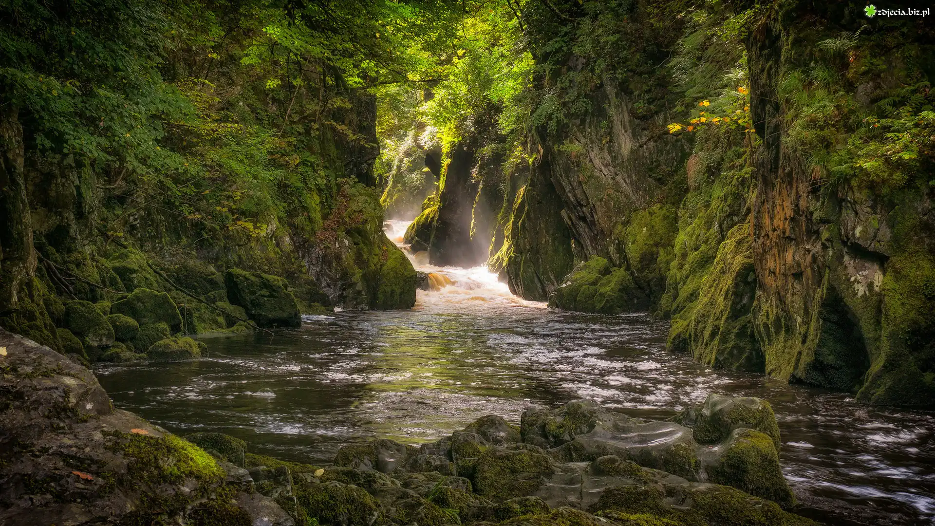 Zdjęcie Wąwóz, Las, Omszałe, Skały, Rzeka