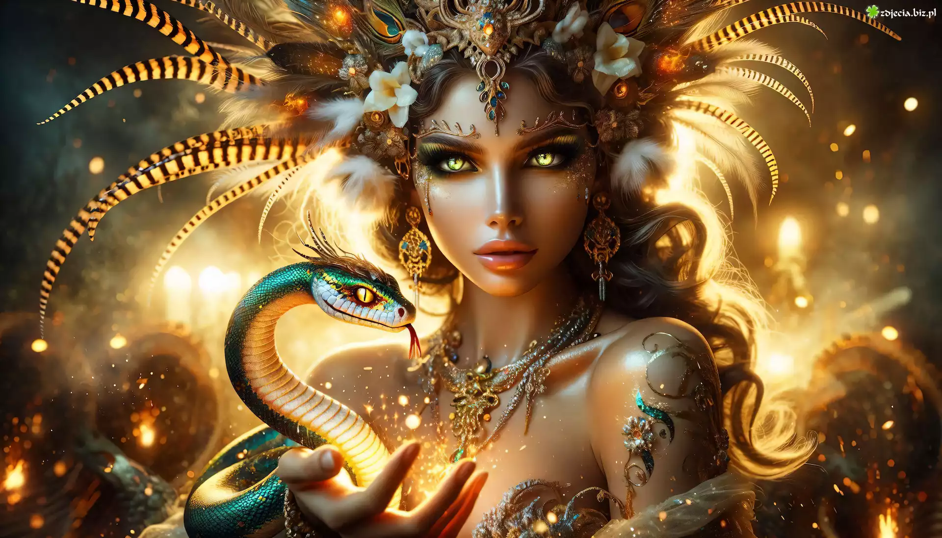 Zdjęcie Kobieta, Wąż, Grafika, Pióra, Biżuteria