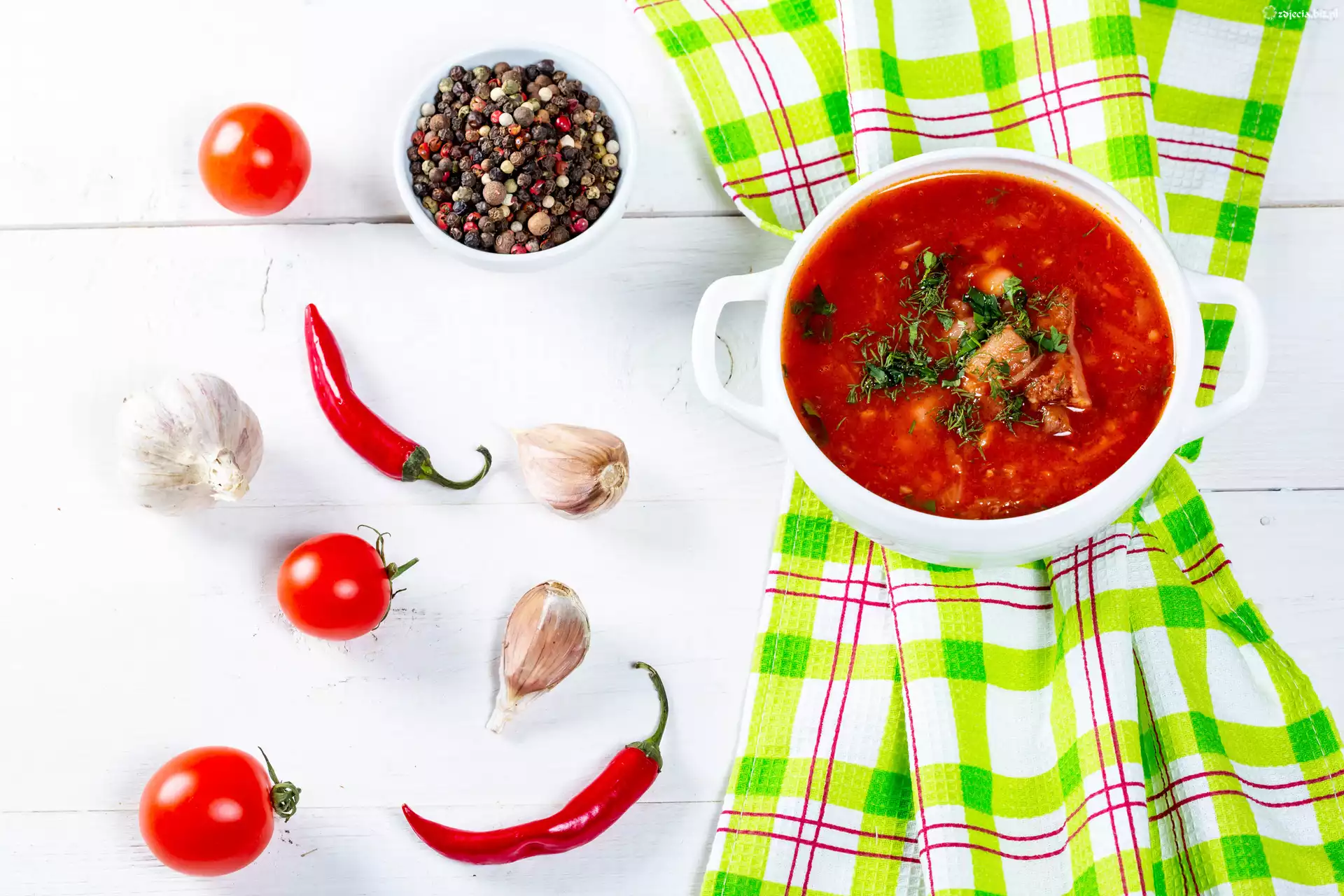 Zdjęcie Zupa, Waza, Ściereczka, Papryczki, Czosnek, Pieprz, Kolorowy, Deski