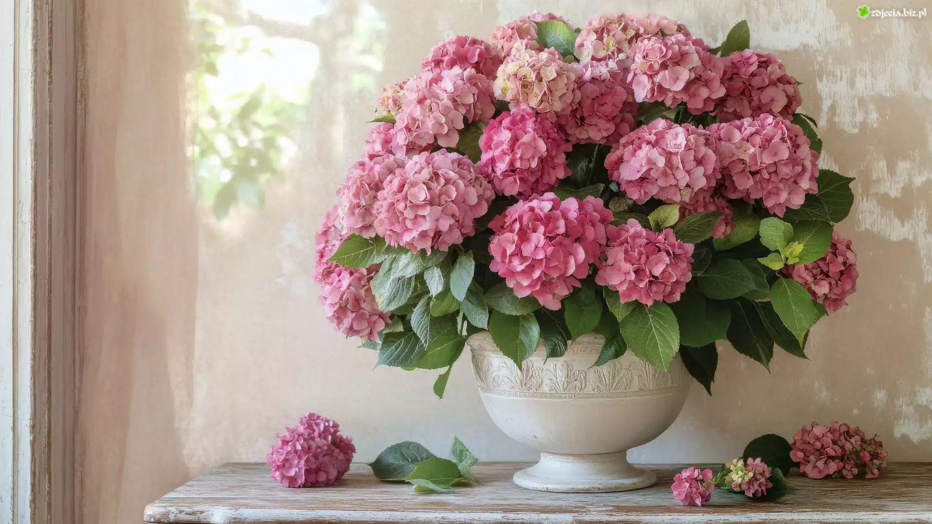 Zdjęcie, Kwiaty, Różowe, Hortensje, Waza