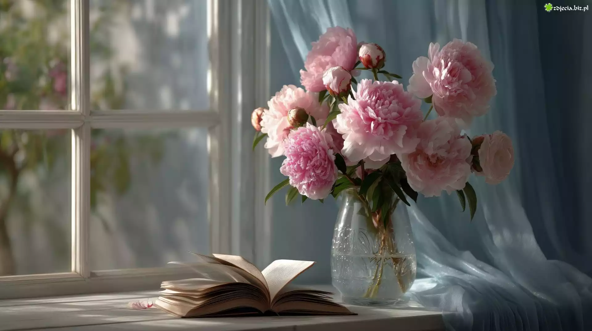 Zdjęcie Kwiaty, Piwonie, Różowe, Wazon, Książka, Parapet, Okno