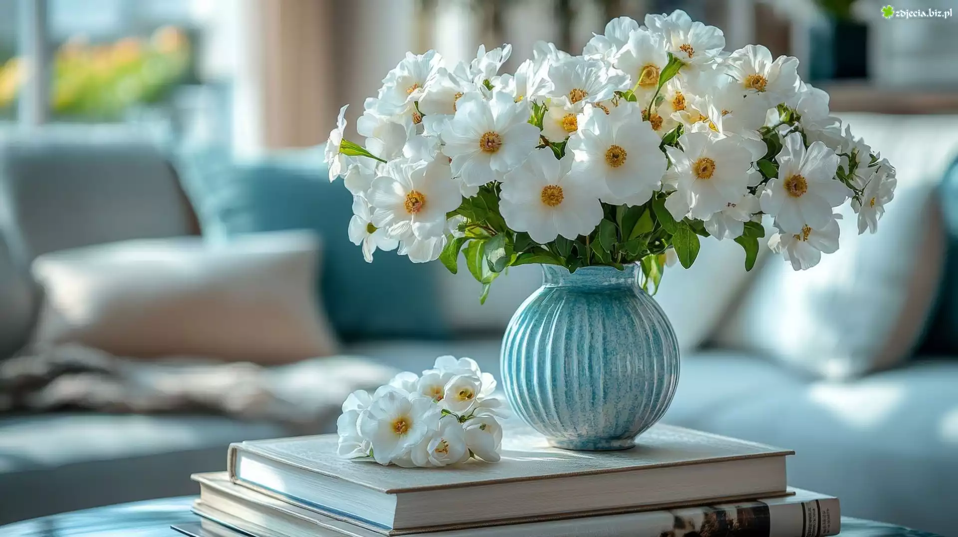 Zdjęcie Kwiaty, Białe, Zawilce, Wazon, Książki, Salon