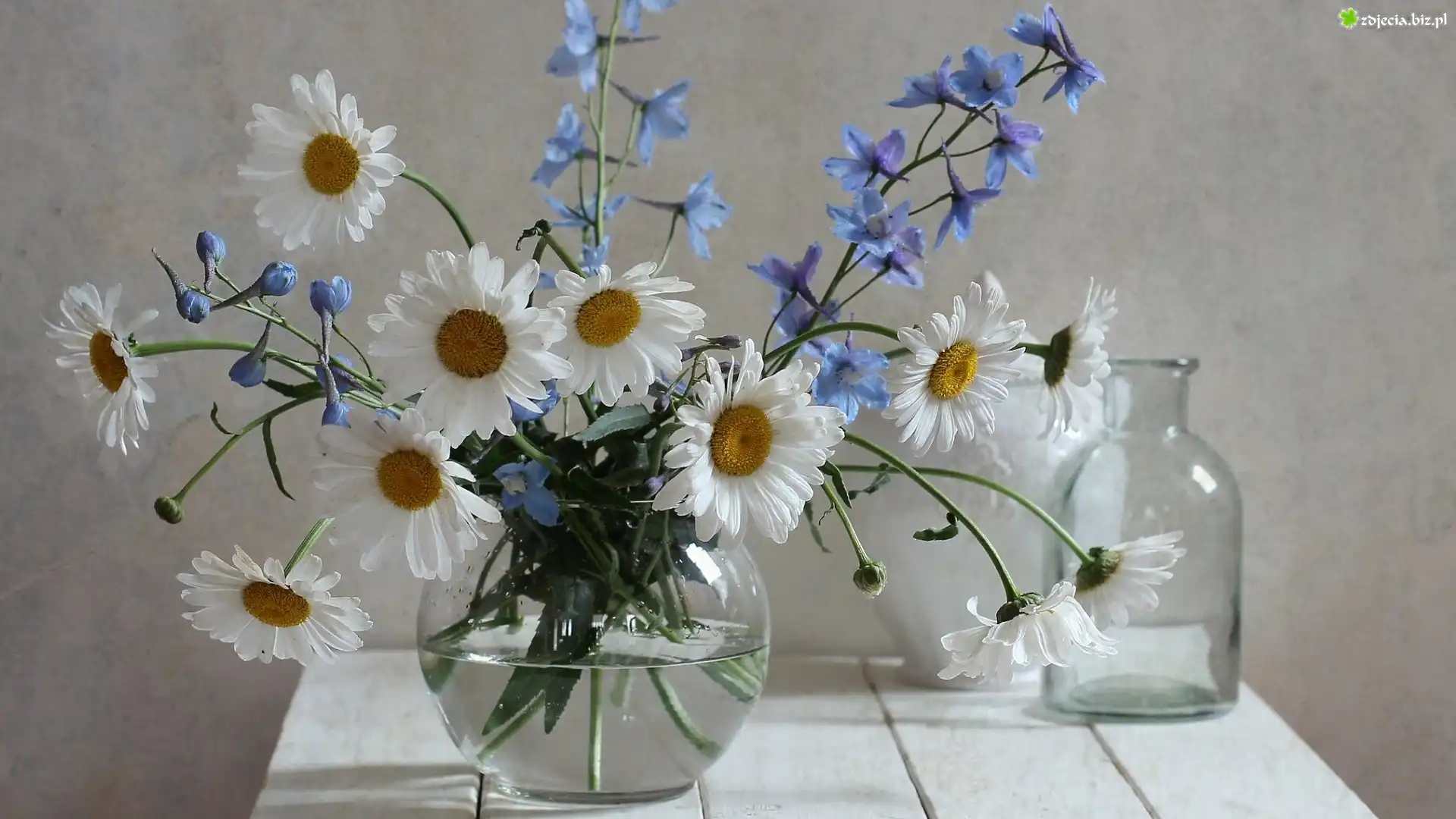 Zdjęcie Niebieskie, Kwiaty, Margerytki, Wazon, Bukiet, Stolik