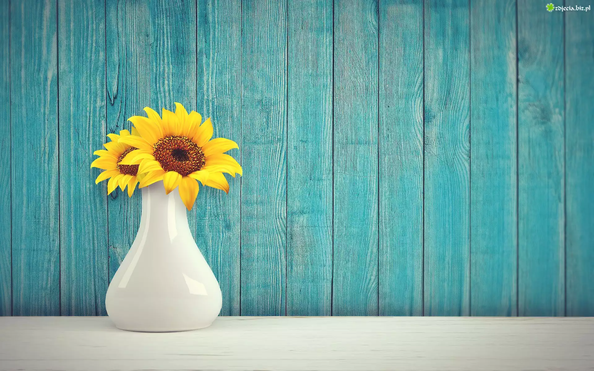 Zdjęcie Wazonik, Dwa, Słoneczniki ozdobne, Niebieskie, Deski