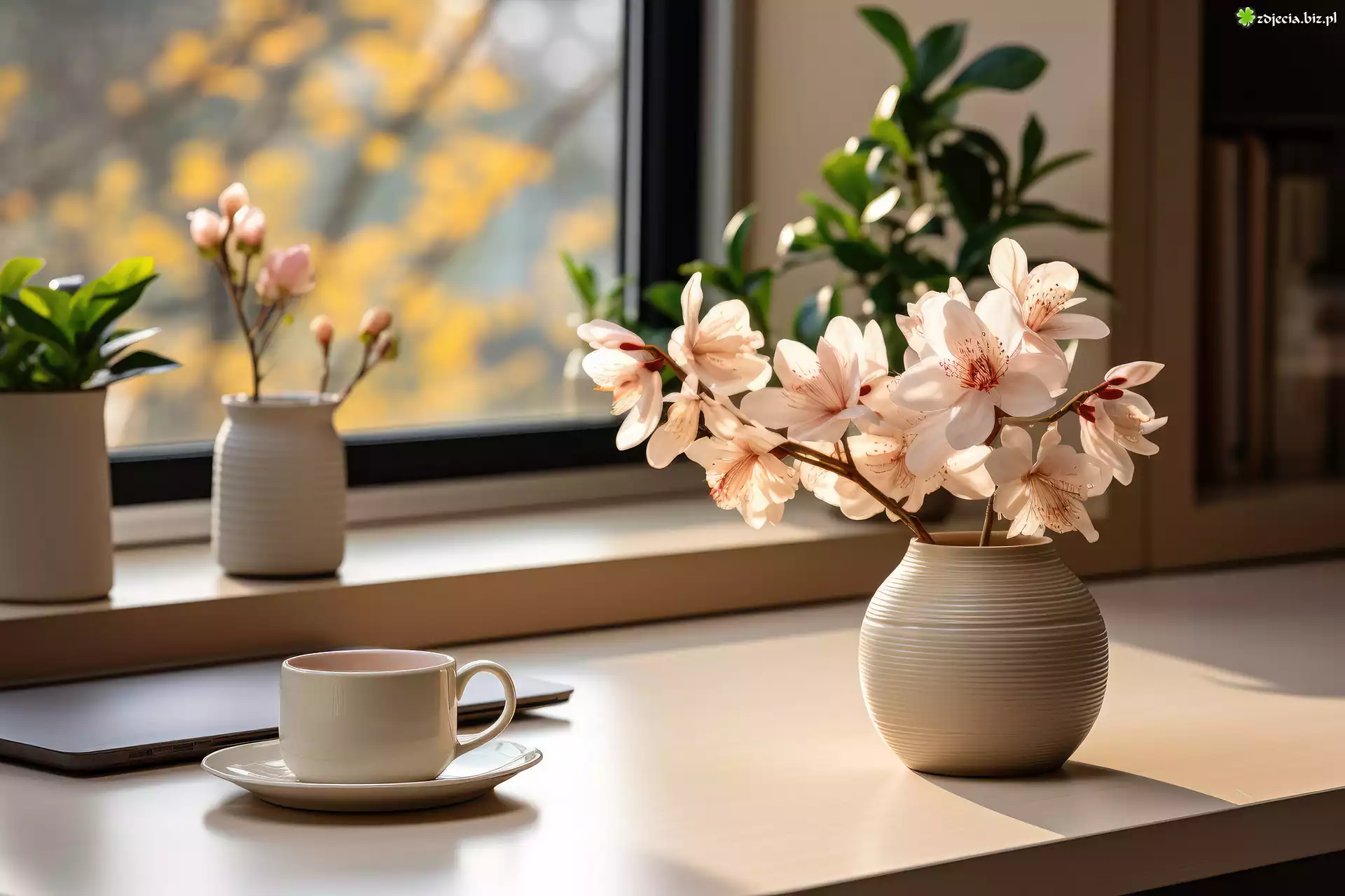 Zdjęcie Kwiaty, Wazony, Filiżanka, Okno, Kompozycja
