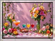 Zdjęcie, Drinki, Róże, Lilie, Wazony, Stół, Kwiaty