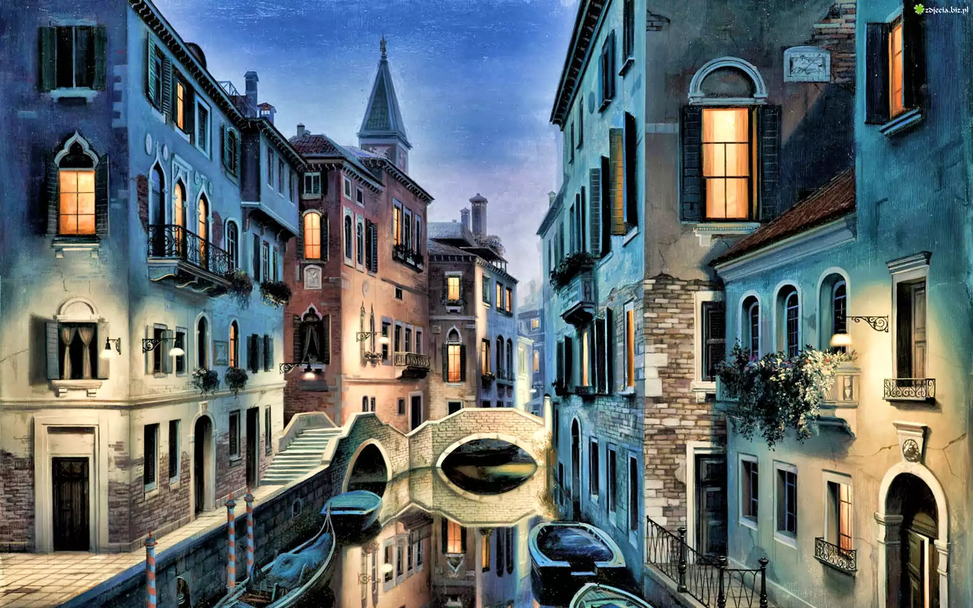 Zdjęcie Wenecja, Domy, Kanał, Gondole, Wieczór