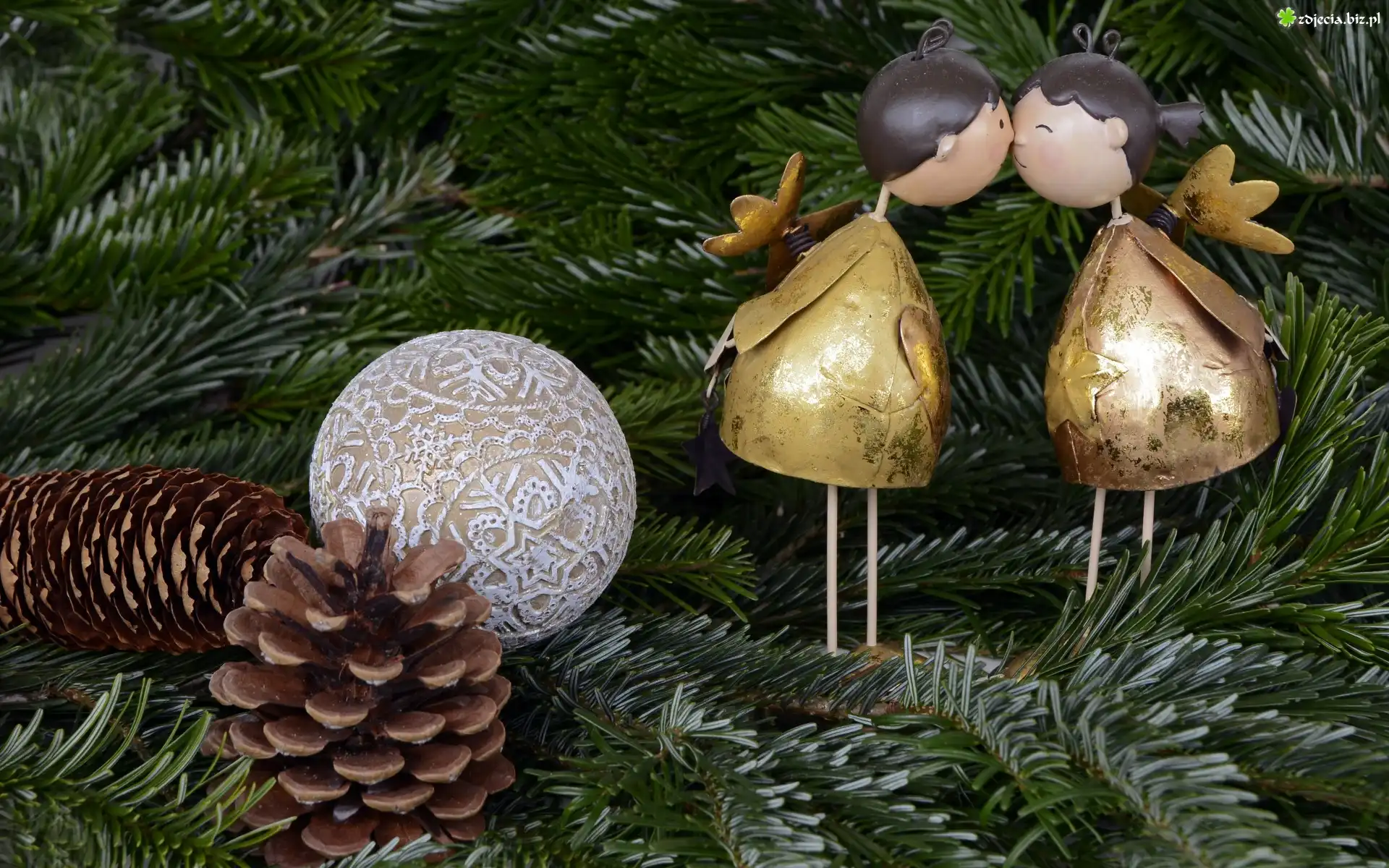 Zdjęcie Dekoracja, Świąteczna, Boże Narodzenie, Bombka, Szyszki, Stroik, Aniołki