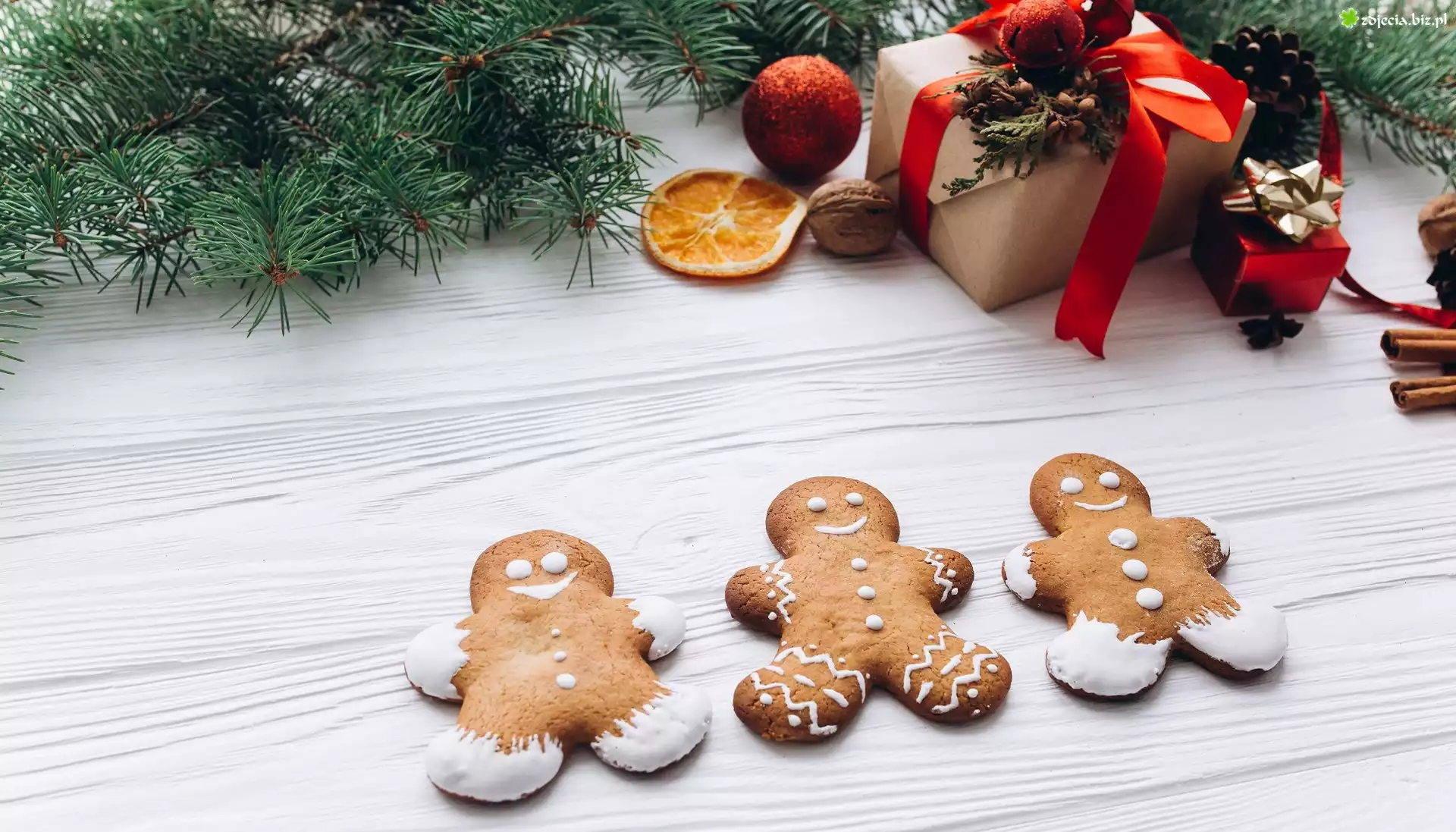 Zdjęcie Kompozycja, Świąteczna, Gałązki, Świerk, Prezent, Pierniczki, Ludziki, Bombka