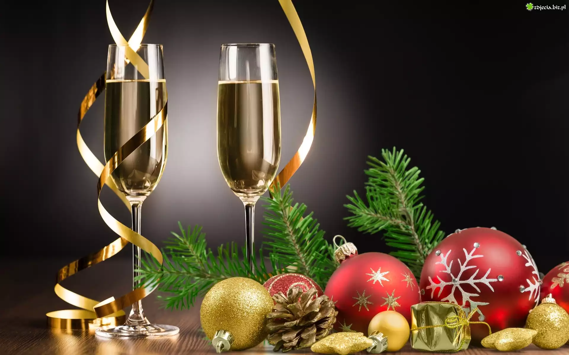 Zdjęcie Kompozycja, Świąteczna, Sylwester, Dwa, Kieliszki, Szampan, Gałązki, Bombki
