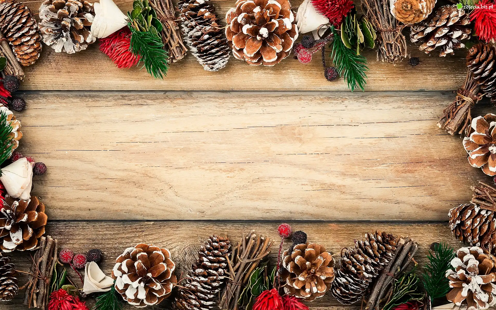 Zdjęcie Dekoracja, Świąteczna, Szyszki, Gałązki, Czerwone, Jagody, Deski