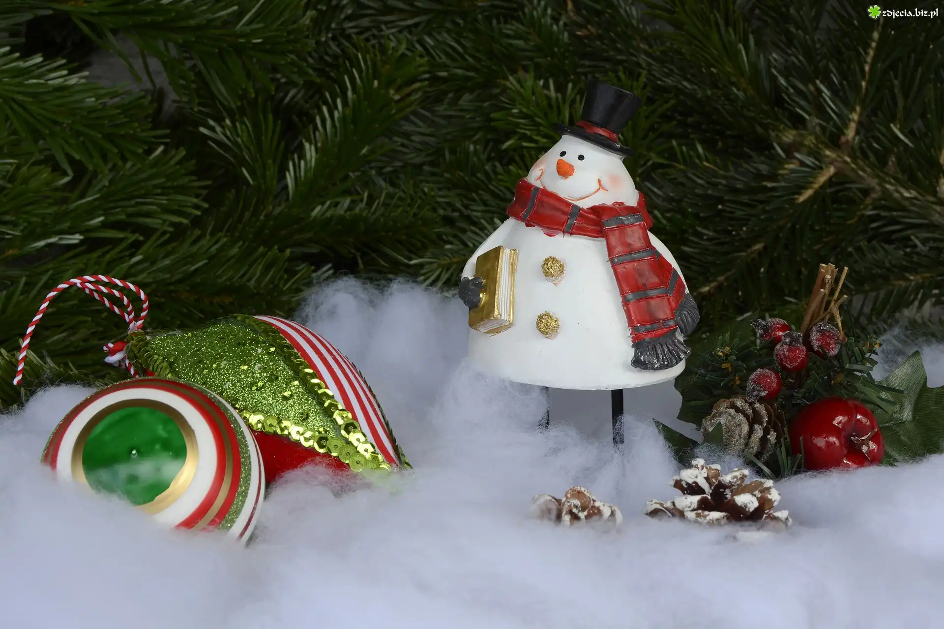 Zdjęcie Dekoracja, Świąteczna, Figurka, Bałwanek, Bombki, Szyszki, Gałązki