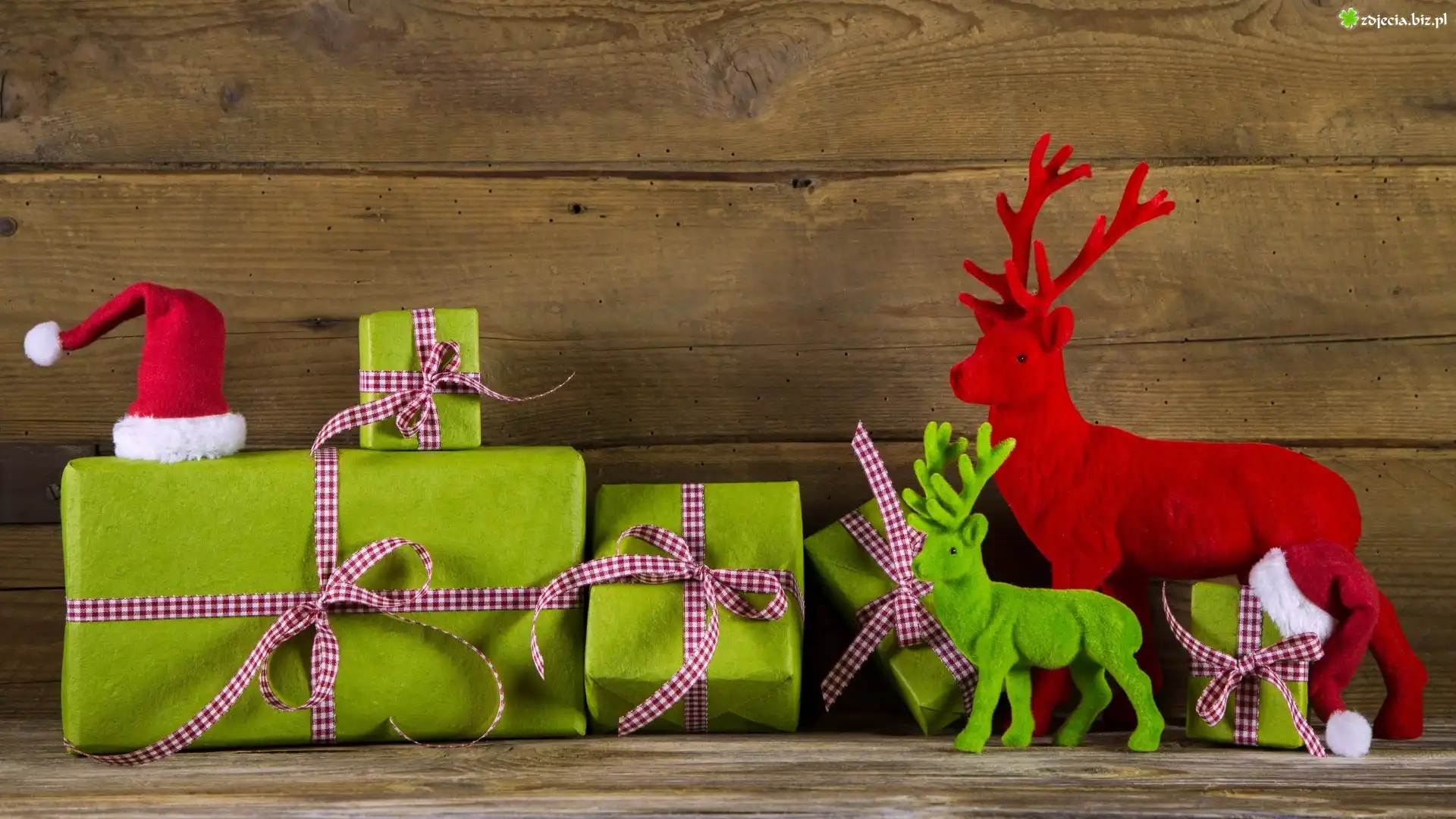 Zdjęcie Kompozycja, Świąteczna, Prezenty, Czapki, Mikołaja, Dwa, Jelonki