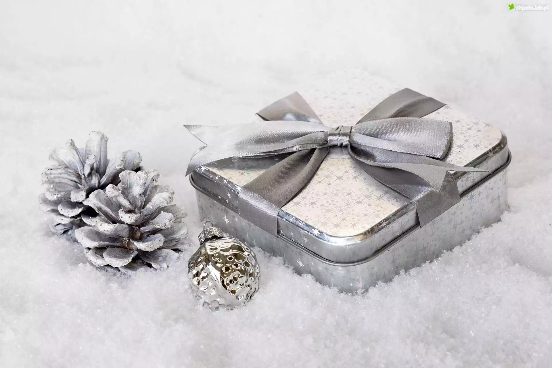 Zdjęcie, Kompozycja, Świąteczna, Prezent, Srebrne, Szyszki, Bombka, Śnieg