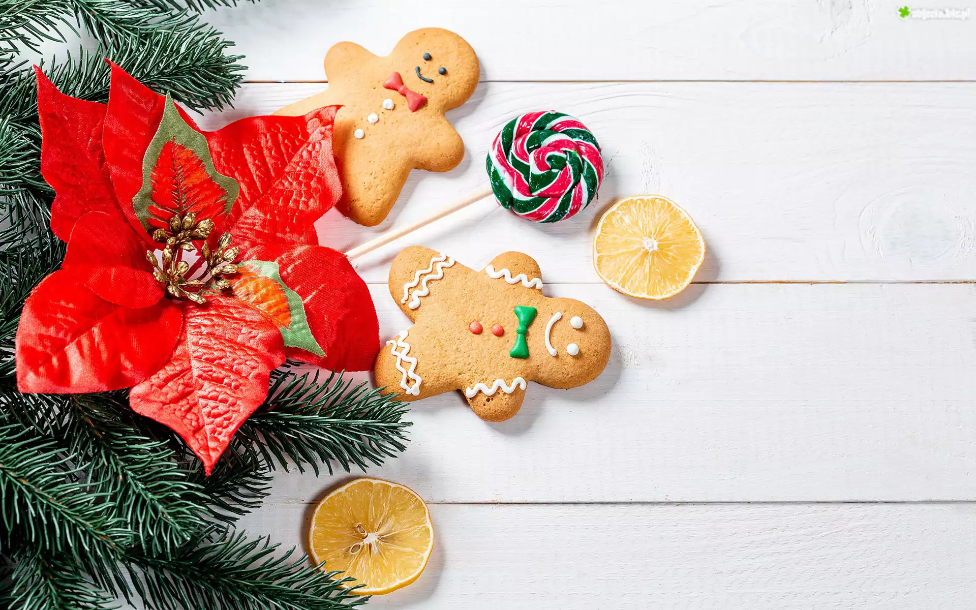 Zdjęcie Świąteczna, Kompozycja, Gałązki, Gwiazda betlejemska, Pierniczki, Lizak