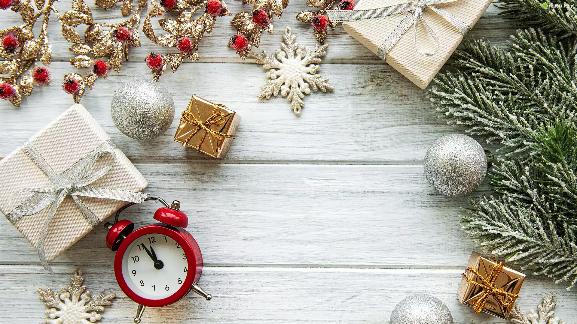 Zdjęcie Świąteczna, Kompozycja, Zegarek, Prezenty, Gałązki, Bombki, Śnieżynki
