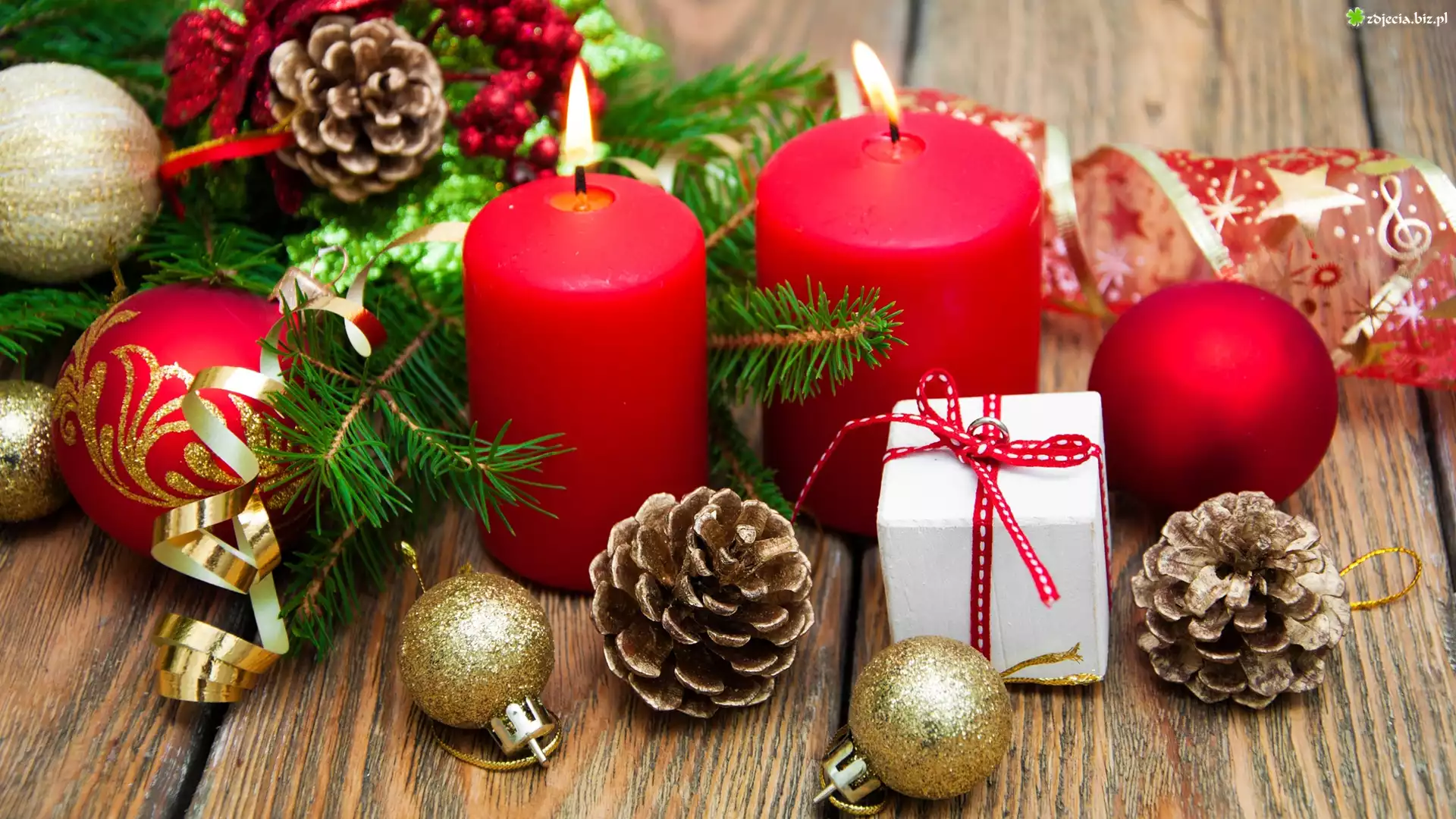 Zdjęcie Kompozycja, Świąteczna, Boże Narodzenie, Czerwone, Świeczki, Bombki, Szyszki