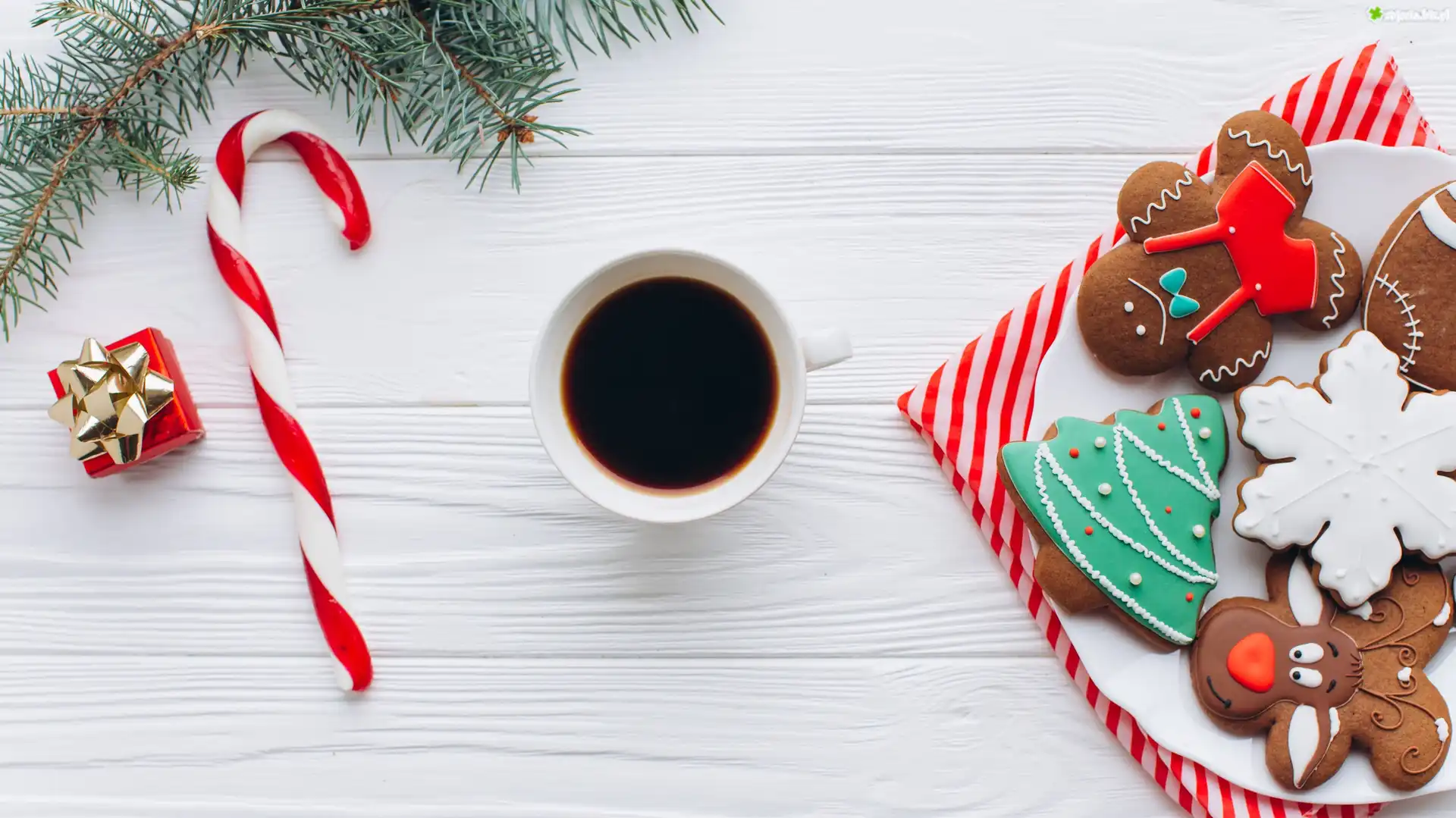 Zdjęcie Świąteczne, Pierniczki, Talerz, Kawa, Prezent, Gałązka