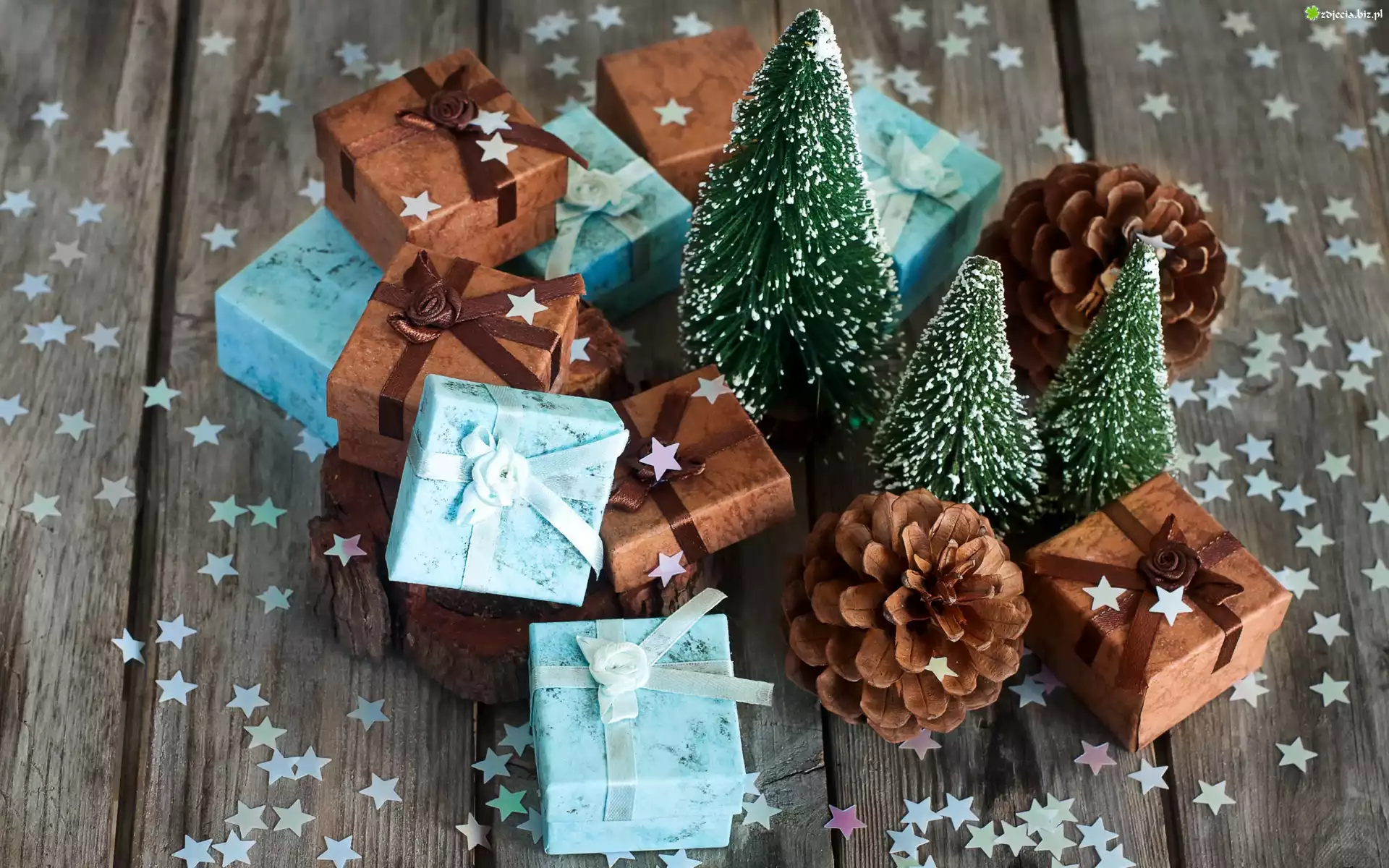 Zdjęcie, Świąteczne, Choinki, Prezenty, Szyszki, Gwiazdki, Wstążki, Deski