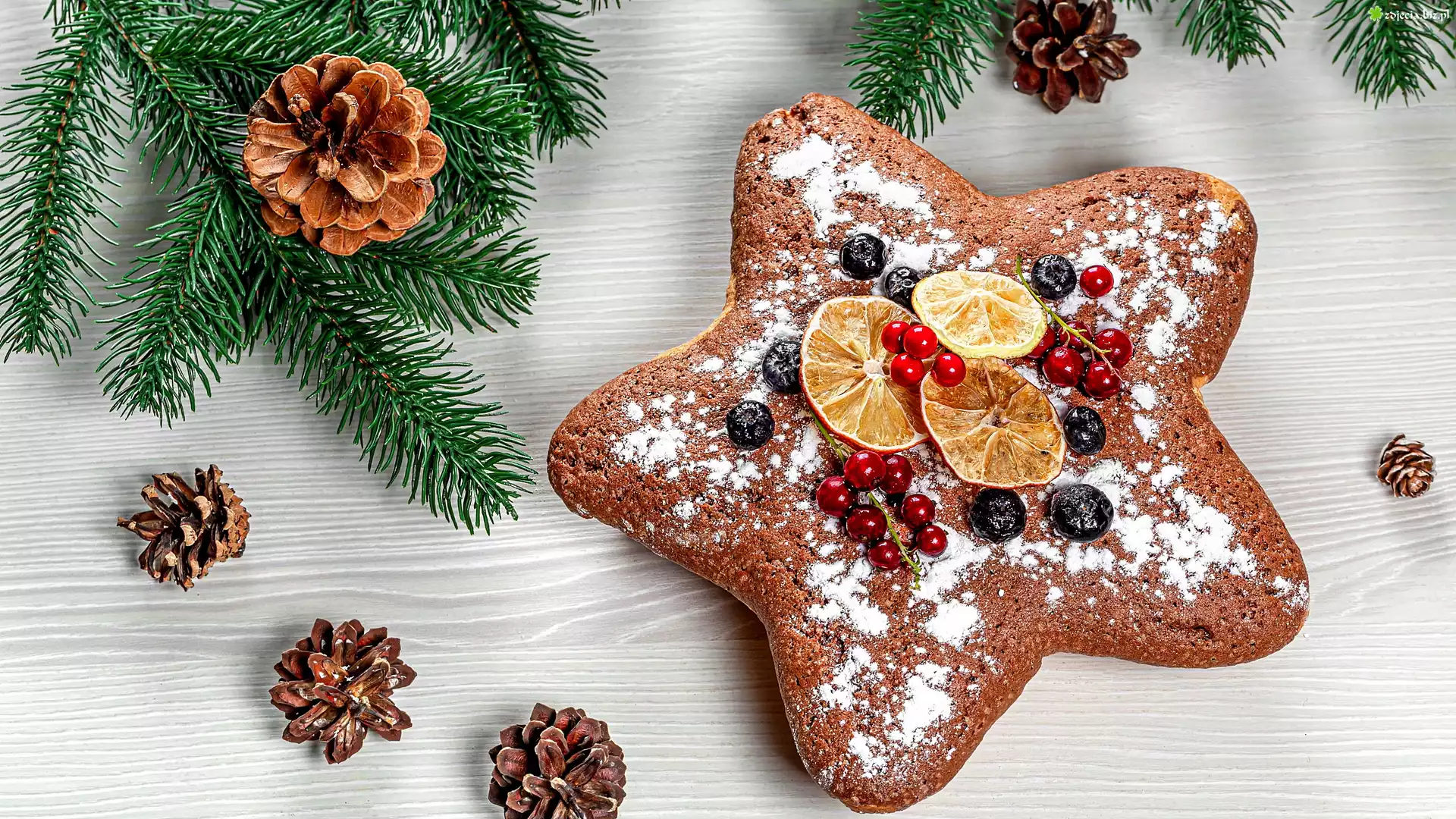 Zdjęcie Gałązki, Świąteczne, Ciasteczka, Piernik, Gwiazda, Owoce, Szyszki, Deski
