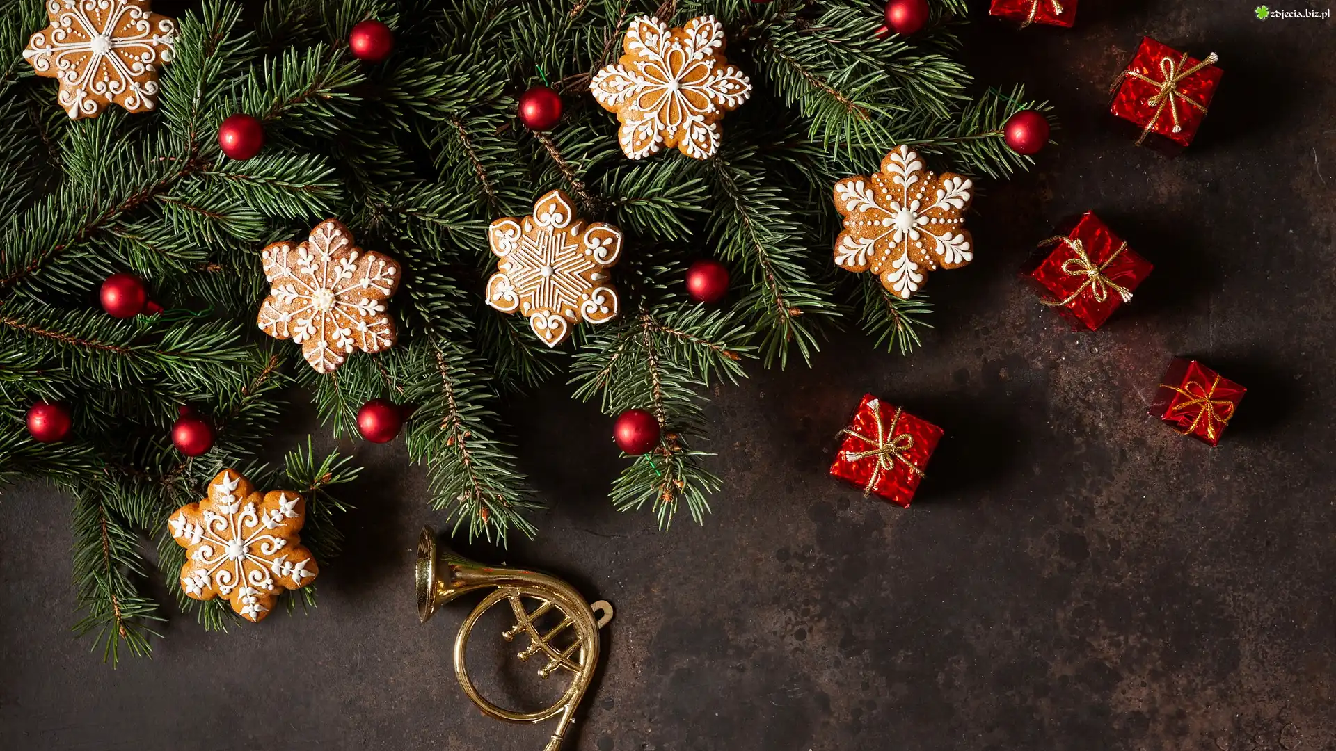 Zdjęcie Świąteczne, Ciasteczka, Pierniki, Zielone, Gałązki, Bombeczki, Prezenciki