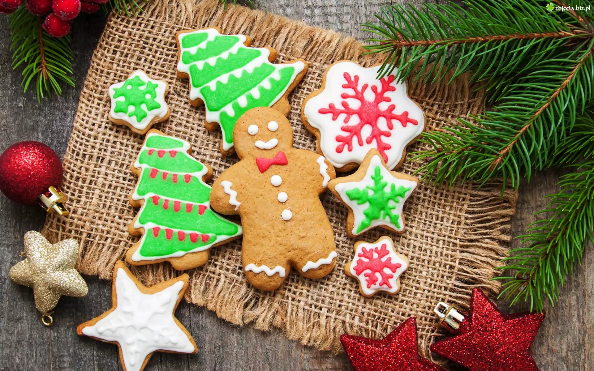 Zdjęcie Świąteczne, Pierniki, Gałązki, Świerku, Bombki, Gwiazdki, Serweta