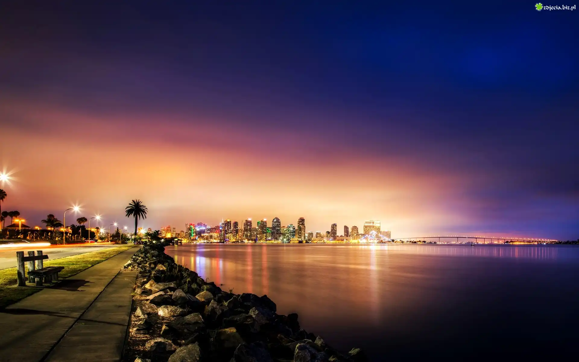 Zdjęcie USA, San Diego, Morze, Wybrzeże, Chodnik, Ławka, Noc, Światła