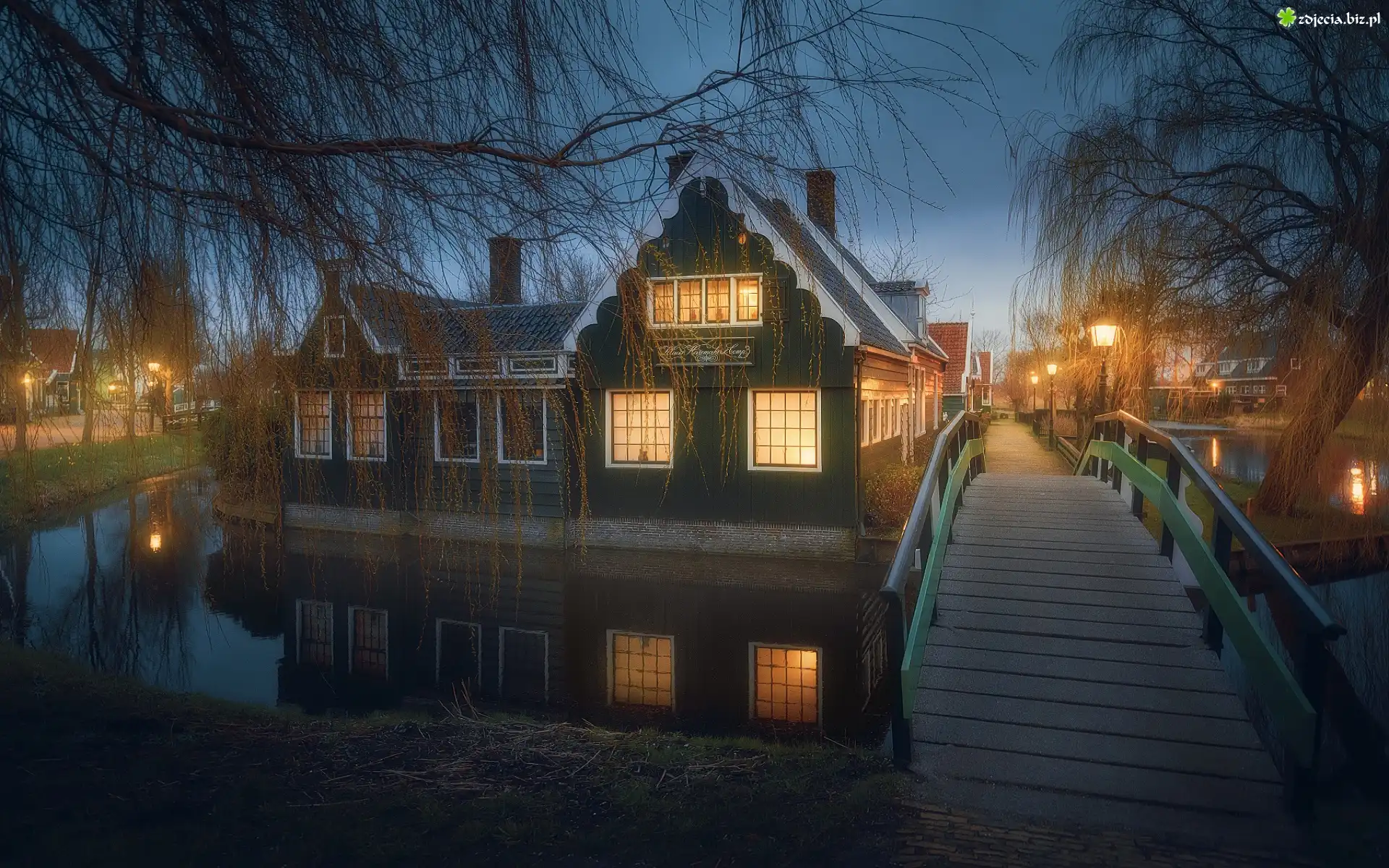 Zdjęcie Domy, Kanał, Mostek, Noc, Latarnie, Światła, Drzewa, Skansen, Zaanse Schans, Zaandam, Holandia |