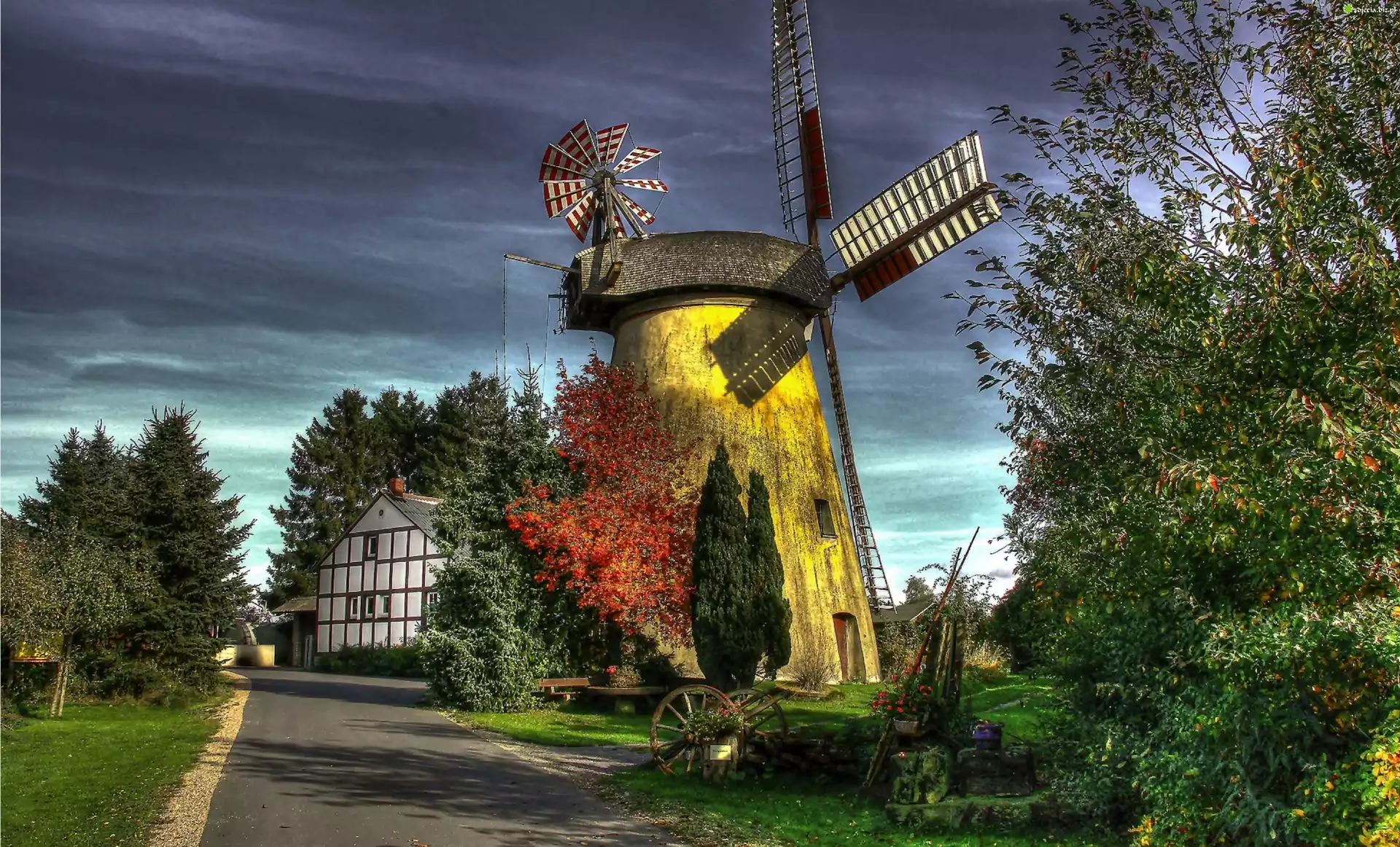 Zdjęcie Wiatrak, Dom, Droga, Drzewa