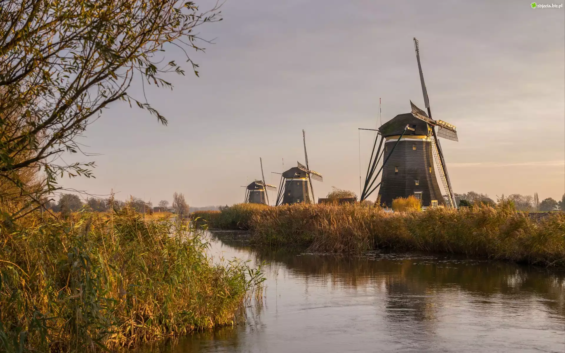 Zdjęcie, Wiatraki, Rzeka, Roślinność, Trawy
