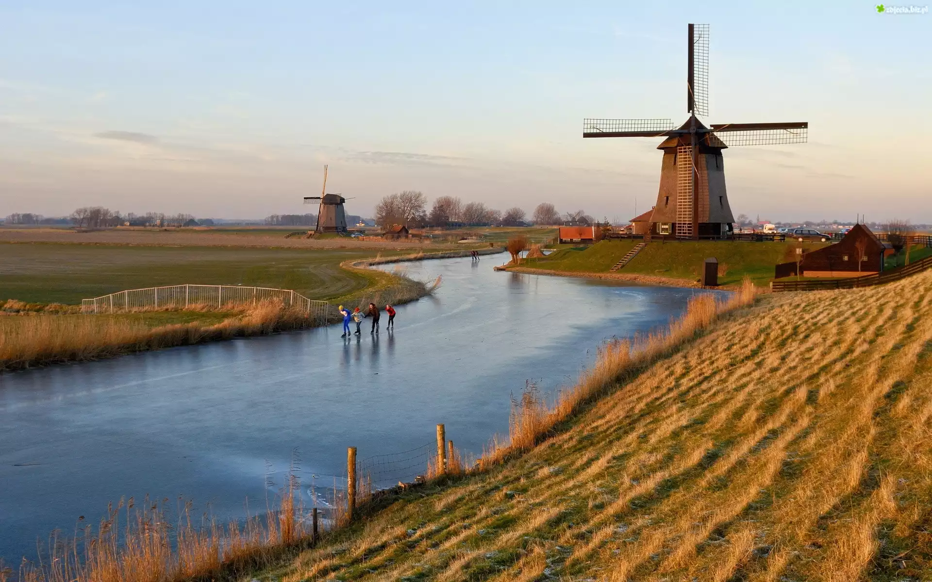 Zdjęcie Wiatraki, Zamarznięta, Rzeka, Łyżwiaże