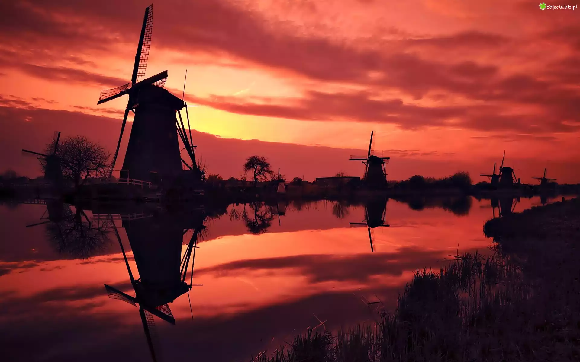 Zdjęcie Wiatraki, Rzeka, Zachód, Słońca