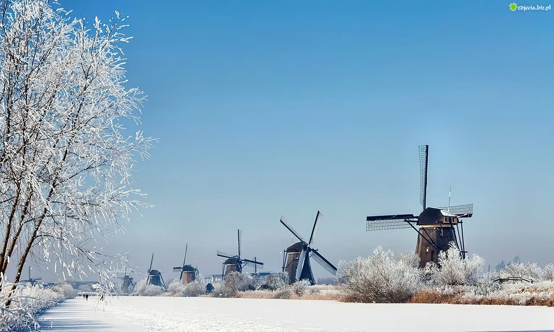 Zdjęcie Wiatraki, Zima, Zamarznięta, Rzeka