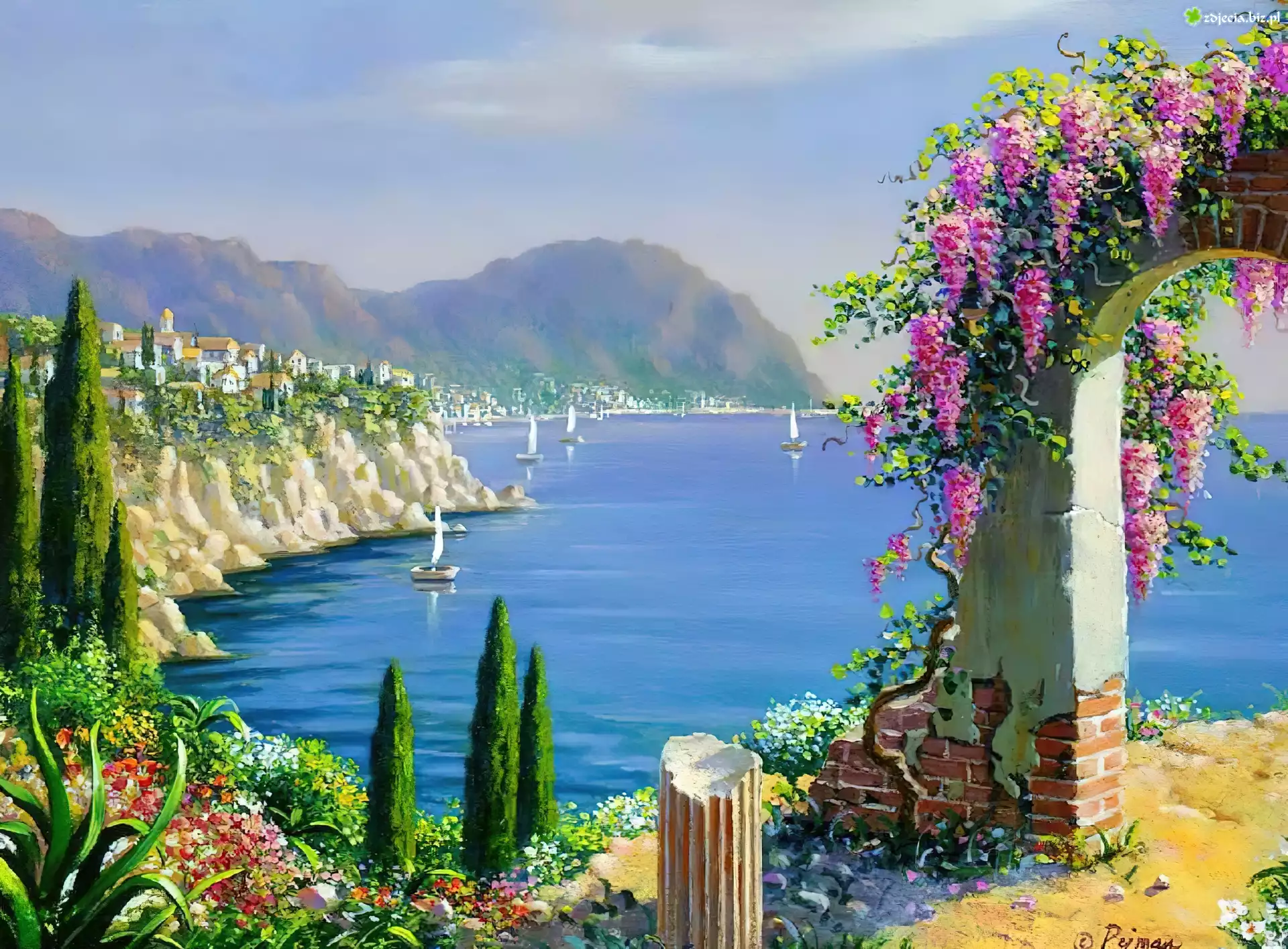 Grecja, Morze, Taras Dom, Basen, Pokój, Leżaki Basen, Dom Koń, Reprodukcja, Obrazu, Marcia Baldwin Wybrzeże, Zachód Słońca, Morze Dom, Woda, Drzewa Wybrzeże, Plaża, Zachodzące, Słońce Smutna, Kobieta, Paw, Kwiaty Miasto, Amalfi, Łódź, Morze, Góry Wybrzeże, Chmury, Przebijające, Światło Wybrzeże, Zatoka Plaża, Morze Wojciech Siudmak, Portret, Kobiety Twarz, Kobiety, Jednorożca, Kolczyki, Kwiaty