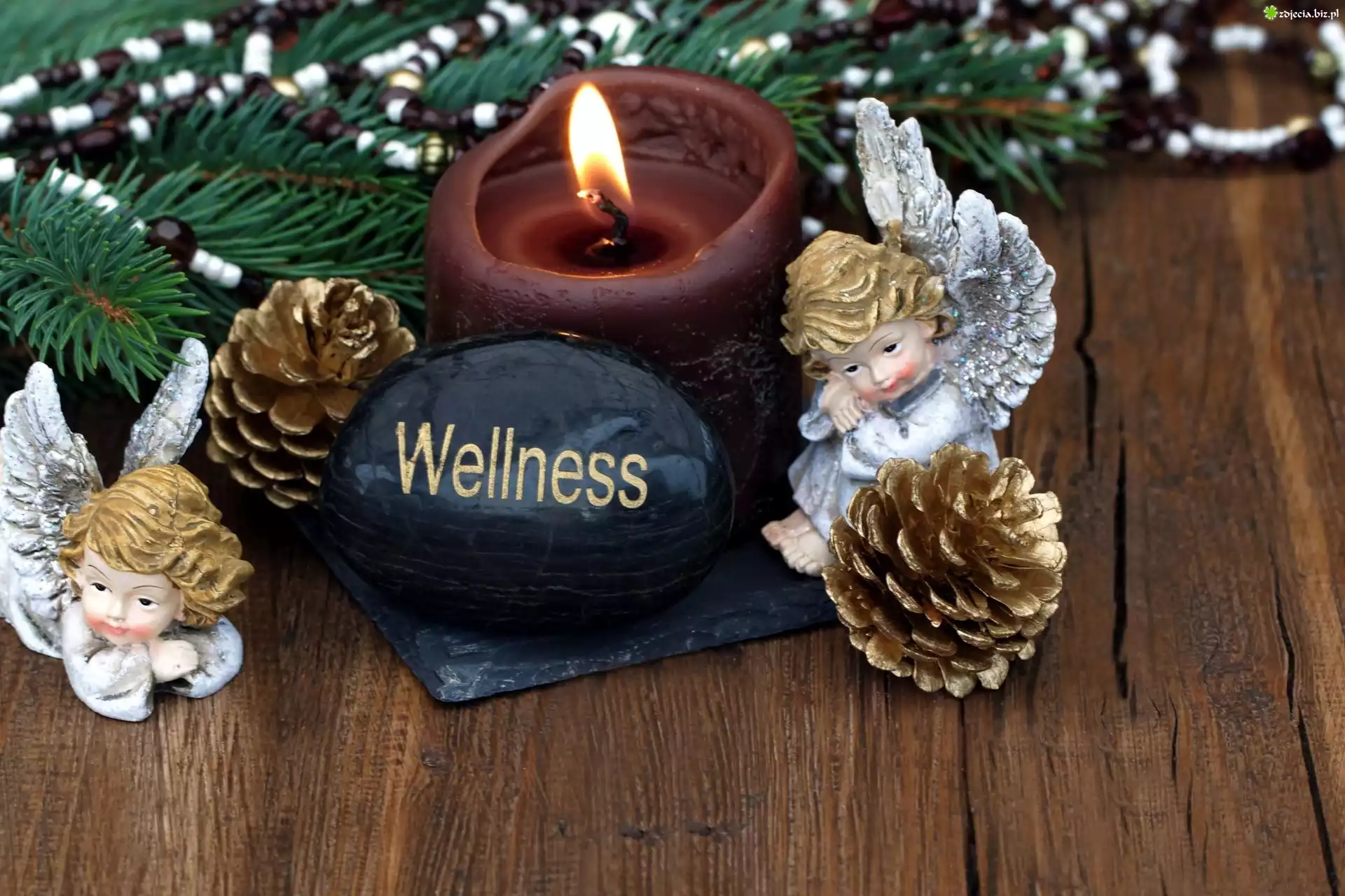 Zdjęcie Świeca, Figurki, Aniołki, Szyszki, Gałązka, Świąteczna Kompozycja