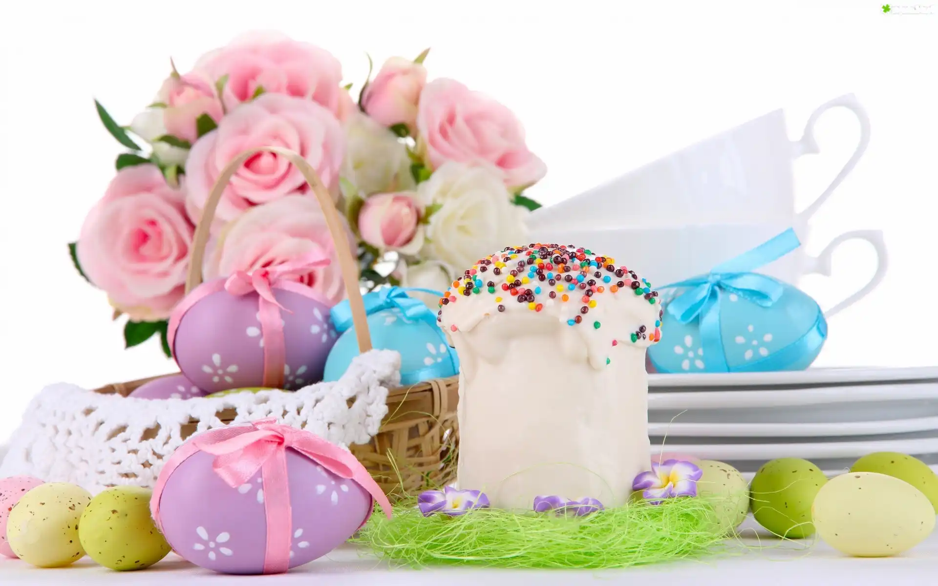 Zdjęcie Wielkanoc, Pisanki, Koszyk, Kwiaty, Babeczka, Kompozycja