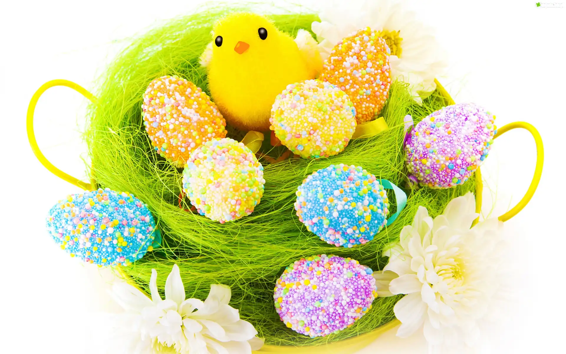 Zdjęcie Wielkanoc, Kurczaczek, Jajka, Kwiaty