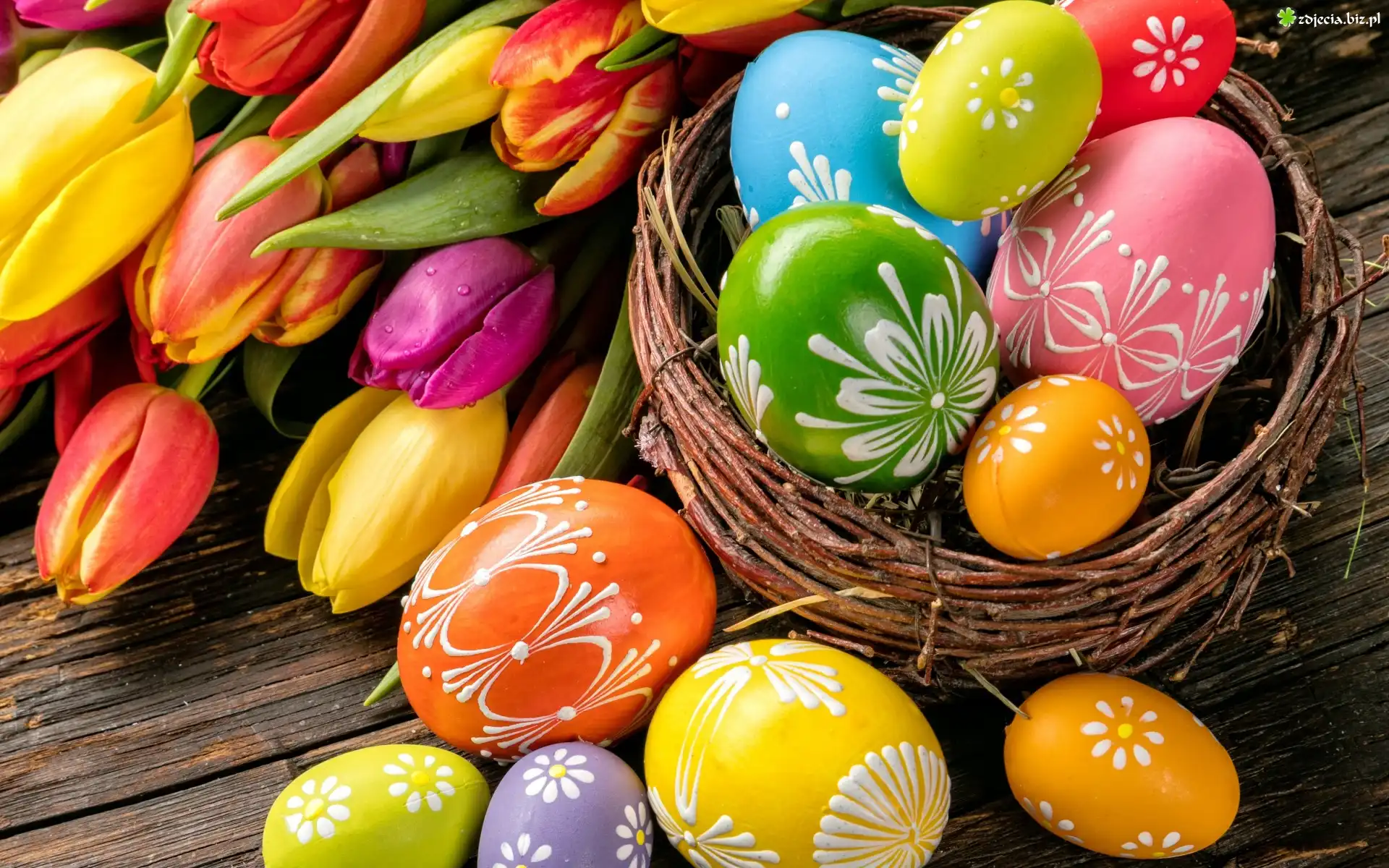 Zdjęcie Wielkanoc, Kompozycja, Kwiaty, Tulipany, Koszyk, Pisanki