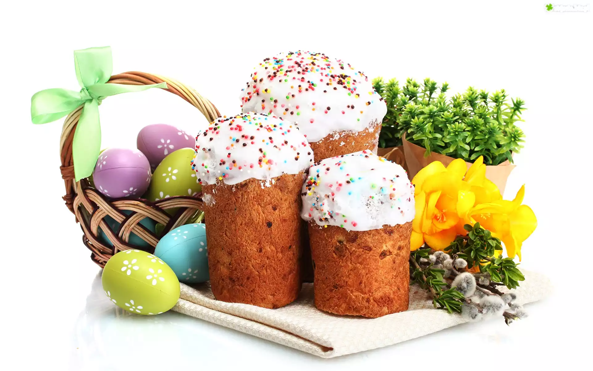 Zdjęcie Wielkanoc, Koszyczek, Pisanki, Babki, Kwiatki, Bazie